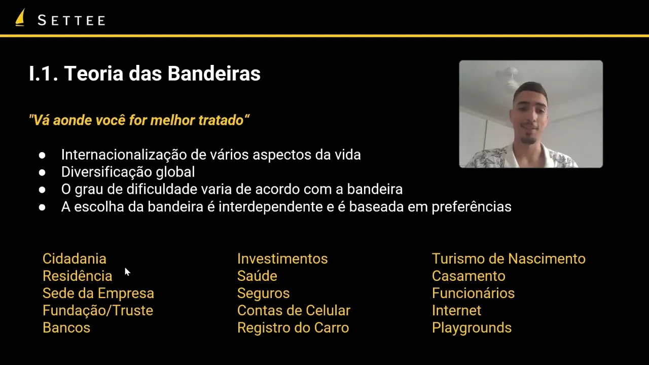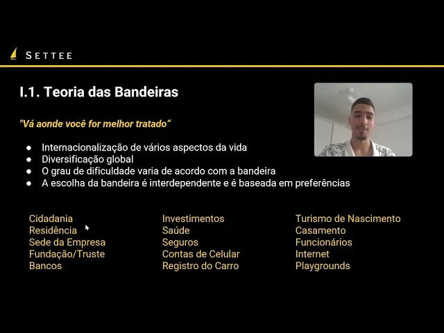 a oportunidades internacionais mas mais importante de tudo e esse é o lema da teoria das Bandeiras é vá aonde você for melhor tratado Vá onde as pessoas te tratam melhor para qualquer um desses aspectos da sua vida então A ideia é internacionalização dos aspectos da vida para tanto ter acesso a mais oportunidades quanto também se proteger a pessoa ainda tem muita gente digamos no Brasil que nasce no Brasil vai trabalhar no banco brasileiro aí tem a sua conta bancária também nesse banco brasileiro a suas economias coloca na poupança nesse banco brasileiro também né então se