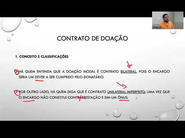 doação com encargo né chamada de doação modal o contrato de doação em geral nós podemos classificar como um unilateral Tá então não há aquele sinal lágrima não há direitos e deveres recíprocos para ambas as partes de forma proporcional não agora quando nós falamos modal ou doação com encargo aí vem a dúvida também seria um contrato unilateral a doação com encargos só para você se lembrar seria aquela doação por exemplo né eu dou um terreno para uma determinada pessoa para que esta pessoa construa no terreno uma creche para crianças carentes por exemplo Então isso é uma
