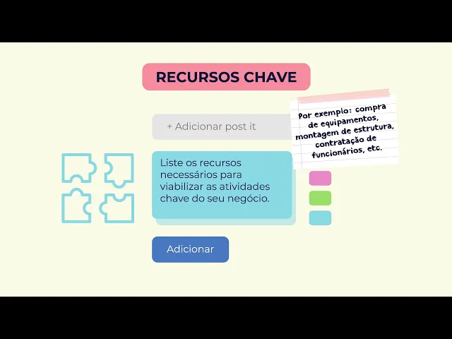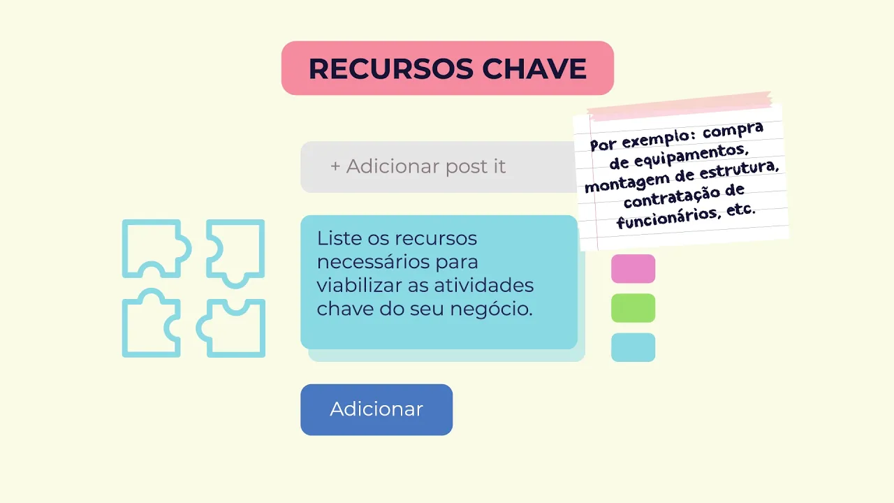 em adicionar post-it list aqui os seus parceiros sócios fornecedores por exemplo vamos adicionar um post para cada item podemos escolher a cor do combustível e para editar basta clicar no símbolo lagos em cada por tite é muito fácil em atividades chave d escreva quais são as atividades essenciais para a existência da sua empresa e para poder entregar a proposta de valor liste os recursos necessários para viabilizar as atividades chave do seu negócio no campo recursos chave por exemplo compra de equipamentos montagem de estrutura contratação de funcionários e 7 o que sua empresa vai oferecer para