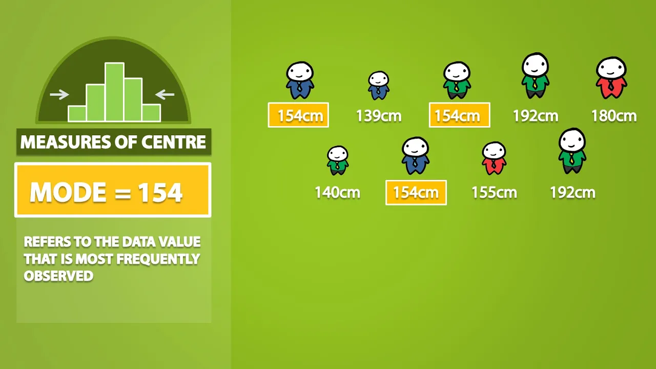 range and standard deviation are measures of spread we will look at how we can determine the measures of center first so suppose I took a random sample of nine people and measured their heights now the mode of a dataset refers to the data value that is most frequently observed notice how the number 154 appears three times in this data set this means that the mode of this data set is equal to 154 now the median refers to the data value that is positioned in the middle of an ordered data set students often forget that to