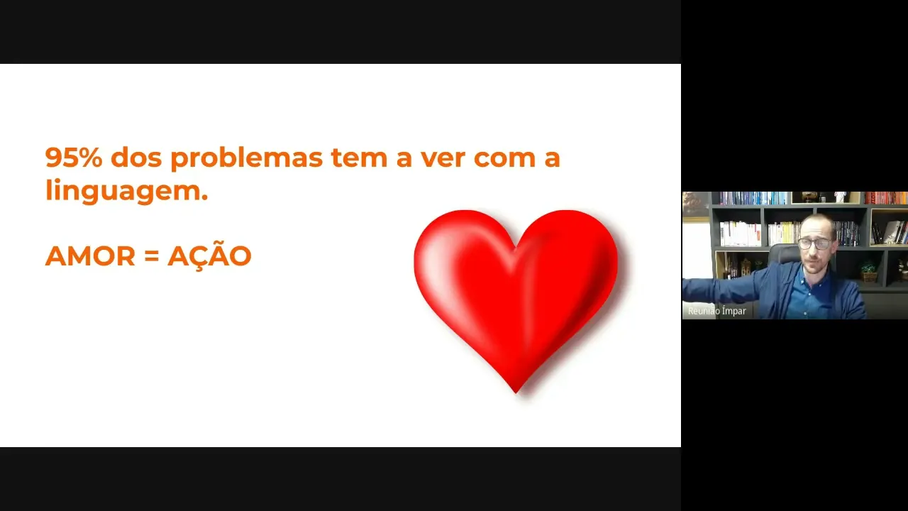 pra gente esquecer disso é que dá os pepinos eu achei uma coisa o cara falou a pessoa achou outra eu achei que tava fazendo bem na verdade tava fazendo mal os problemas são sempre de linguagem e o amor ele é uma ação uma coisa que ficou muito marcado também na nas mentorias que eu comecei a fazer e comecei a entrar mais em casamentos e casais etc etc etc foi ver que a maioria das pessoas elas têm a visão de que casei com uma pessoa ou tô namorando com a pessoa a gente entra numa caixinha do