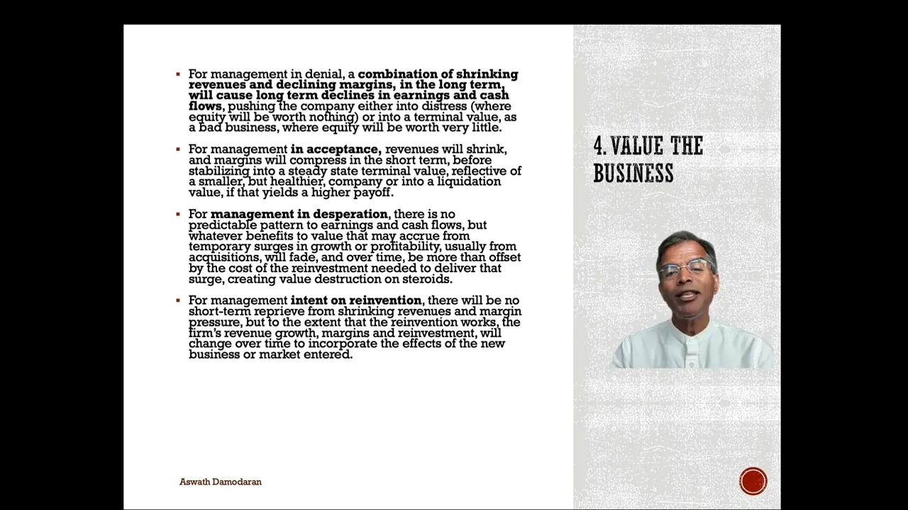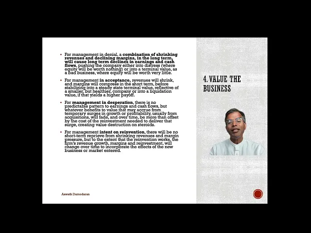hi welcome back we've talked about valuing startups high growth firms mature firms and in this session I want to talk about valuing declining companies what is it that you look for in a declining company the first is you're going to see revenues that are either stagnant or declining over time second is your margins are under pressure they're either shrinking or maybe even negative the third is this company is selling off stuff rather than investing in stuff they're divesting assets know sometimes to get cash sometimes to make themselves smaller along the way though some of these firms will try to do Acquisitions it's almost like they're trying to reorient their asset base selling some assets buying others and usually at declining firms you're going to see big cash payouts big dividends big BuyBacks and if there is a downside to debt it's in declining firms you're going to see it what's a downside of debt while it gives you tax advantages it exposes you to distress in declining firms you're more like to see the distress effect shrinking or stagnant revenues margins Under Pressure assets being redeployed sold off added on big payouts and distress the distress might or might not be there depending on whether there's debt but those are usually the characteristics so what are valuation challenges when you're looking at Assets in place which should be almost all of the value your declining firm don't be surprised if those Investments that the company's made on earning less than their cost of Capital At first side you're saying that makes no sense why would companies do that remember that when these companies made their Investments that wasn't the case they were actually earning more than their cost of capital but that was 5 years ago 10 years ago 20 years ago maybe even 50 years ago today the business has changed those com those those assets are earning less than the cost of capital that will also mean that when you value these value these assets don't be surprised if the value you get is less than the book value of the assets the second is we talked about these companies making devages sometimes because they need cash and sometimes to restructure their asset portfolio Dev vestages though create consequences in valuation they create discontinuities in the data if I sell off one of the four divisions I have as a company what you're going to see in the revenues and income in the year that happens is going to be a drop in revenues and a drop in income now Dev vestages can also affect know Mar Marin and reinvestment so it becomes much more difficult to assess what the company is earning as a return in invested capital on its assets and finally risk parameters whether they be based on price-based data or earnings based data are going to shift when you devest off significant portions of your company when it comes to growth assets your first response is what growth assets these are declining companies here growth is negative growth the compan is shrinking and the question you're asking is it shrinking in a sensible way what does that mean you shrink in a sensible way it basically means you're divesting assets or shutting down assets that earn well below your cost of capital you're able to get your Capital back but divestures can lead to negative growth rates psychologically that is difficult for us to handle as human beings when we value companies we feel almost programmed to put in a positive growth rate but if a company's divesting in getting smaller you have to be okay using a negative Revenue growth rate your revenues get smaller over time and some declining firms which are in denial what does that mean they don't recognize that are in in Decline they think they can go back to growth will continue to reinvest and as they reinvest and earn well below their cost of capital the more they grow the less valuable they will become so those are challenges that you will face in val declining companies and there are risk components as well now we talked about declining firms often returning cash to shareholders which is a sensible thing to do you're declining and shrinking you sh but those dividends and BuyBacks will have effects on your Equity because every time you pay a dividend to buyback stock you're reducing your Equity you're saying so what if the company is not also reducing its debt this is your pathway to distress your Equity gets small your debt stays where it is and you can very quickly find yourself go going from being a healthy firm to a distressed firm when you devest assets if those assets are riskier or safer than the rest of the assets in your business you got to re-evaluate the effect on your hurdle rate and cost of capital and Fin finally as I said if you don't pay down debt the presence of distress which is going to shorten sooner or later is going to affect all of your parameters your ratings will drop your cost of debt will climb your cost of equity will climb your cost of capital will become higher and more unstable so from valuation perspective the challenges you face with declining companies is you can't do what you're programmed to do in valuation grow yourself out of the problem cuz growth is not the option that is a available here so let's summarize the issues you're looking at a declining firm you ask the four questions what are my cash flows from existing assets you look at my at the past history you see shrinking revenues margins under pressure and along the way you might find that you're being challenged by you know litigation and other issues that come with being a declining firm especially in the in the presence of distress growth can be negative and that's something that you have to accept as a given it's not a good thing it's it's not a bad thing it is what it is as a declining firm your Revenue growth can be negative your company will get smaller your risk can Shi can shift especially if you're selling off businesses shutting down businesses and to the question of when