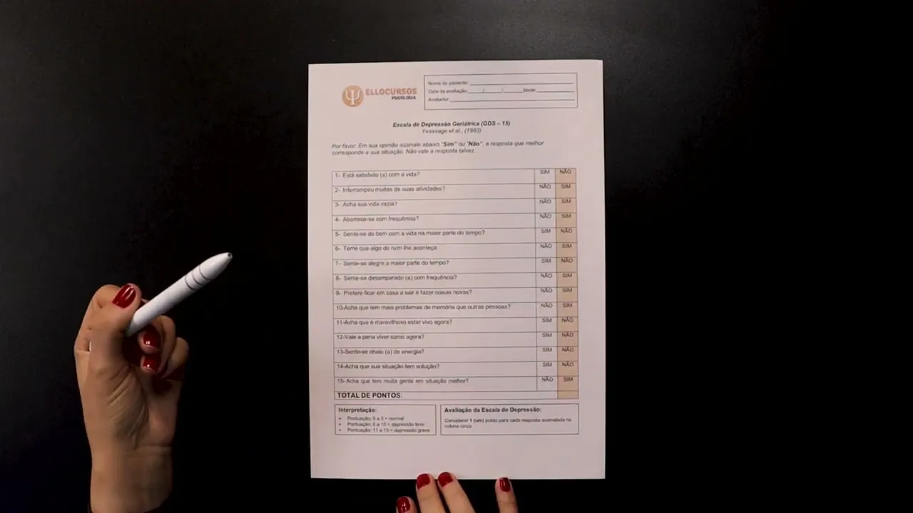 [Música] agora dentro da avaliação de humor a gente vai mostrar a escala de depressão geriátrica GDS 15 tá bom E aí então a gente vai solicitar ali que Em sua opinião assin sim ou não né pra resposta que melhor corresponder a situação aí que precisa e não vale talvez tá tem que ser sim ou não é complicado porque tem hora que a gente acha que é Talvez Mas eles colocam de uma forma que ó está satisfeito com a vida ou você tá ou você não tá então eh eh eles fazem aí o o questionamento para