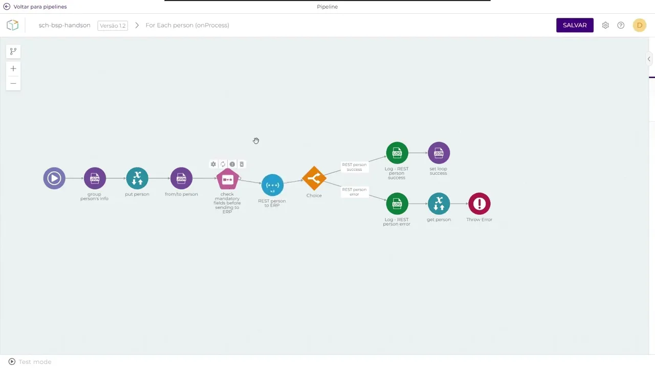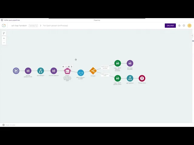 agora com a plataforma aberta vamos entender melhor o resumo da execução na prática então aqui temos o seguinte como um caso semelhante ao exemplo dado na aula teórica temos uma base de dados que oferece informações nessa base de dados em caso de sucesso ela acessa um for it que para cada registro vai fazer uma requisição um post aqui vai entregar esses dados para algum lugar só que aqui temos um detalhe caso essa requisição Def falha por algum motivo ou os itens mandatórios não estejam presentes no pad qualquer motivo que seja resultante em erro ele irá