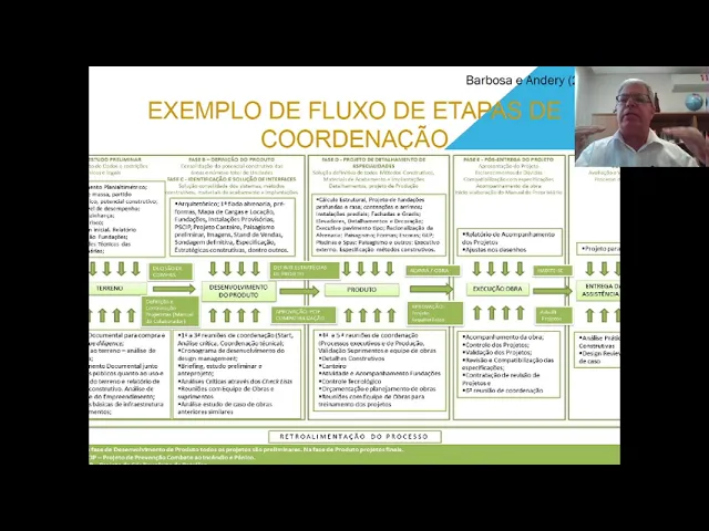 o pingo continuando aí Alguns insights sobre a gestão do processo de projeto Ele trabalha então esta dimensão é que eu tô chamando dimensão horizontal ou de coordenação gerencial nós temos que ter como acabar vamos viver um fluxo de trabalho aparece a coordenação gerencial esse fluxo é brevemente ilustrado esquematicamente representado aí nessa figura né é a ideia aqui vai ficar lendo cada um quadro da figura eles estão um material bibliográfico que foi disponibilizado aos alunos É mas no fundo A ideia é mostrar então que eu tenho uma determinada atividade uma determinada fase se vocês olham na