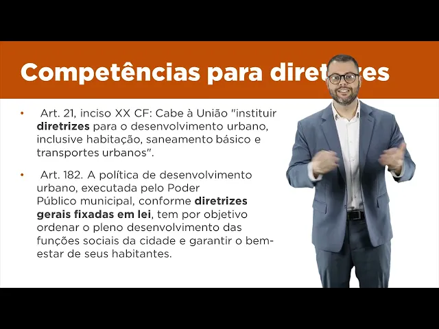 E aí pessoal tudo bem Nesta aula eu abordarei o assunto das competências no direito urbanístico esse tema das competências é bastante complexo aqui no direito urbanístico porque todas as esferas da Federação acabam atuando nesta matéria ou seja existe competência urbanística para União para os Estados para o Distrito Federal e também para os municípios Tá certo então para entender para compreender esse assunto complexo é muito importante que nós dividamos esse assunto Em competência Legislativa ou seja competência para criar leis de Direito urbanístico de um lado e de outro lado competências materiais ou executórias competências para aplicar