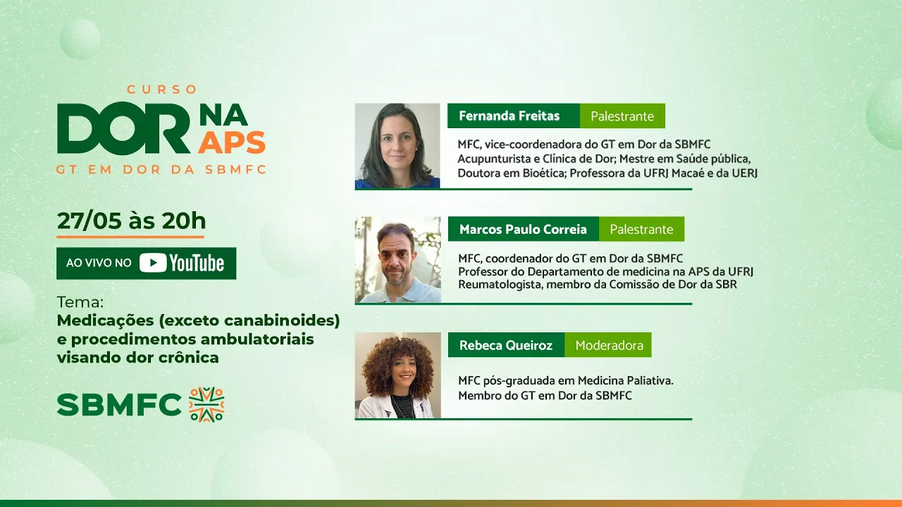 Poo inizi ok Olá boa noite Eh estamos começando mais um curso de dor aqui da atenção primária em saúde e hoje nós vamos abordar medicações exceto carabid canabinoides desculpa eh e procedimentos em saúde acho que caiu eh a aula de hoje vai ser com a Dra Fernanda Freitas caiu acredito gente tô L ouvindo oi tá ouvindo Ok então voltando aqui aula de hoje com a d Fernanda Freitas eista mador clínica de d ah professora na Universidade Federal do Rio de Janeiro e tambémm não erge o Dr Marcos Paulo V Correia eh coordenador do grupo de