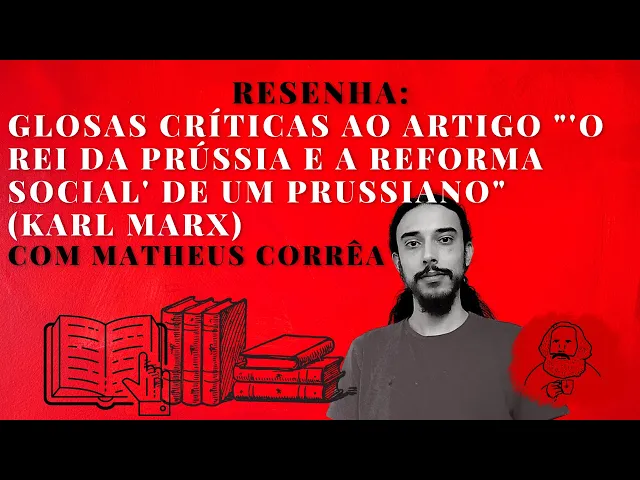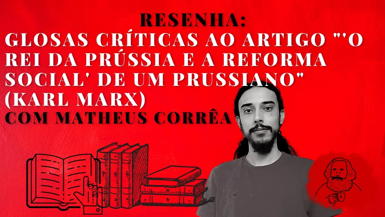 o Olá a todos meu nome é Matheus Eu sou graduando em direito pela UFMG e também sou membro do grupo de pesquisa tinta vermelha e seguindo os nossos esforços para gravar a relatoria do texto que estão sendo alvo das discussões do nosso ciclo introdutório do grupo de estudo com esse mestre que está pegando textos do próprio Marx de 1843 1848 eu tô aqui hoje para Expor os pontos principais do texto gosos críticas marginais ao artigo o rei da Prússia reforma social de um Cristiano que é referente a nossa terceira reunião e foi escrito pelo próprio