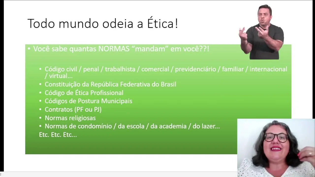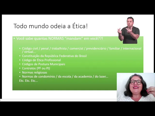 Você sabia que a gente é totalmente tomado por normas e regras e que por causa disso apesar da gente discutir tanto a ética você sabia que no fundo no fundo todo mundo odeia ética é essa é uma verdade nua e crua que eu trago aqui para vocês nós somos um cardápio variado de normas que mandam em nós olha aí como exemplo nessa projeção eu tô Citando os códigos todos trabalhista familiar comercial penal civil internacional virtual ao pessoal que tá fazendo a pós em bioética se tiver gente do direito depois manda mensagem para mim lá na