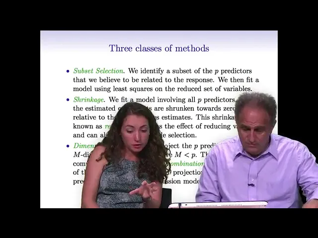 find the best among all possible combinations but try to do an intelligent search through the space of models so fourth step wise backward stepwise in all subsets and then some more modern techniques known as shrinkage methods in which we don't actually select variables explicitly but rather we we put on a penalty to penalize the model for the um the number of coefficients or the size of coefficients in various ways so we'll talk about Ridge regression and the lasso in the shrinkage section now finally in the third section Dimension reduction we'll talk about ways of finding