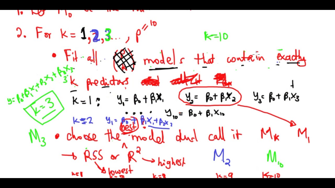 sum of squares or equivalently the largest r squared and so in this way I get a best model containing 0 1 2 all the way through P predictors I've called them m0 m1m2 all the way through MP and now I'm on to step three and in this final step all that I need to do is choose the best model out of m0 through MP and in order to do this actually um this this step three is a little bit subtle because we need to be very careful that we choose a model that really has the