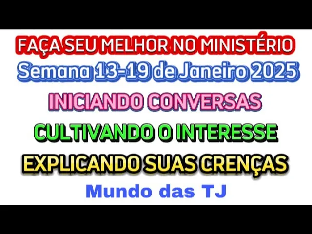 Olá meus queridos irmãos e amigos sejam todos bem-vindos mais uma vez aqui no nosso canal mundo das Testemunhas de Jeová nesse vídeo nós estaremos preparando a parte Faça seu melhor no ministério da semana 13 a 19 de Janeiro se você está com uma dessas três designações fique conosco até o final do vídeo que eu tenho certeza que vai facilitar a sua preparação Então vamos para o nosso vídeo [Música] então sejam todos bem-vindos É um prazer imenso ter vocês aqui para juntos agora prepararmos as nossas designações Espero que possa facilitar sua preparação e que assim você