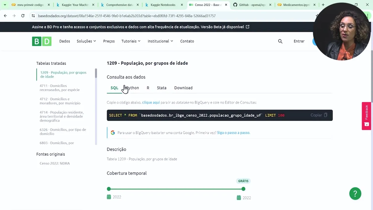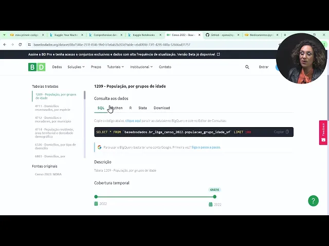 buscar esses dados aqui e utilizar os seus códigos por exemplo para trabalhar então eu vou clicar em senso 2022 E aí ele tá dizendo que aqui você pode conhecer em detalhe Como vive o nosso povo e aí eu tenho aqui com como consultar os dados através de um SQL de um Python de um R eu posso clicar em Python E aí nós temos lá ó Import base dos dados SBD E aí ele tem um DF que é um dataframe e tá pedindo para fazer a leitura e aí ele tem aqui as instruções do que que