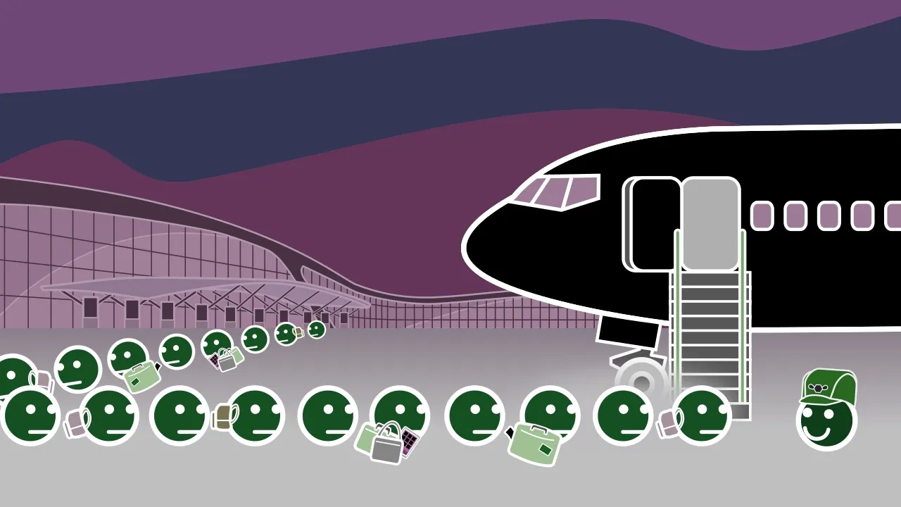 [Inaudible airport announcements] [Grey sighs] What’s the fastest way to board an airplane? I mean, you can’t just throw open the gates like funneling cattle into a chute. That’s not for us.