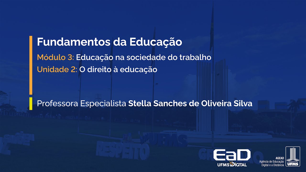 [Música] Olá eu sou professor Estela Sanches de Oliveira Silva responsável pela disciplina fundamentos da educação nossa aula é sobre o módulo 3 Educação na sociedade do trabalho unidade 1 educação como processo social e organização do trabalho esta aula é baseada na leitura obrigatória de Carlos Roberto Jamil Cury o texto tem como título direito a educação direito a igualdade direito a diferença publicado em caderno de pesquisa está disponível o link e vamos então pensar um pouco começar pelo contexto histórico social e econômico do final do século 20 nesse momento histórico temos que pensar que houve uma