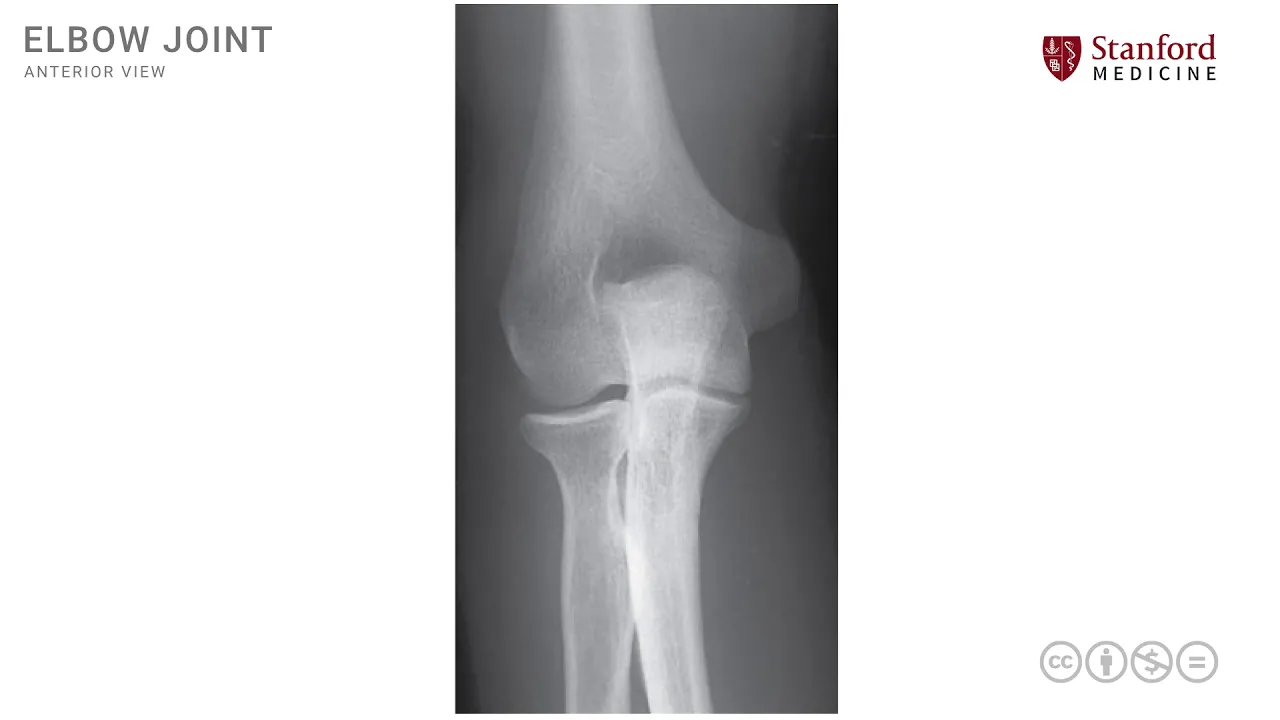 here which accommodates the coronoid process in full flexion similarly we have a radial fossa which is seen over here to accommodate the radial head in full flexion these are some of the key structures in the arab elbow region let's now look at a simple x-ray this is a plane ap x-ray in anteroposterior x-ray of the right elbow joint and we can see some of the same structures again this is the humerus which is the distal end of this bone we can also see the ulna and the radius more distally over here this is the radius