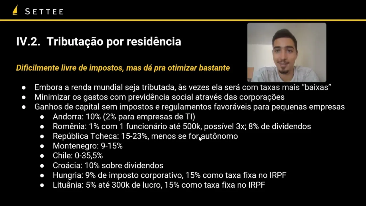 vou pagar um pouco mas eu vou ter uma boa qualidade de vida eu vou ter segurança eu vou ter um curso de vida mais baixo eu vou ter contatos sociais melhores então a vida social melhor eu vou ter sei lá mais liberdade eu vou ter acesso a um passaporte bom daqui alguns anos então assim tem vários motivos pelos quais você pode escolher e para um país de tributação por residência é mesmo que você vai pagar alguns impostos isso ainda pode valer muito a pena e aqui você quer também evitar os gastos com previdência social com