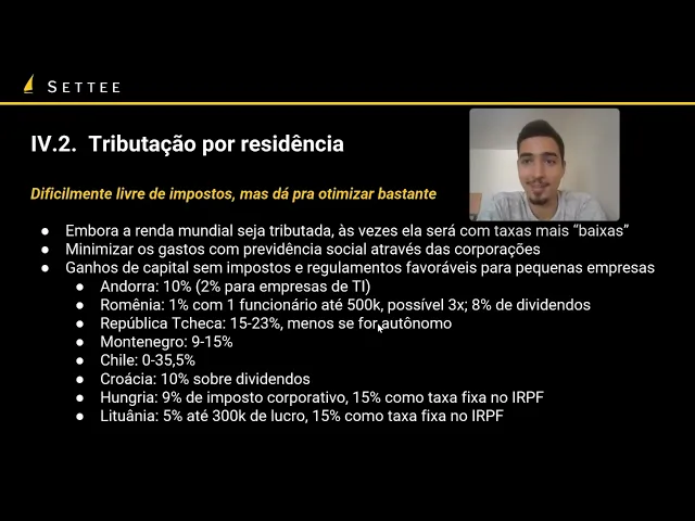 Olá aqui é o Francisco das sete mais uma vez começando um novo módulo nessas próximas aulas a gente vai falar sobre os diferentes sistemas tributários ao redor do mundo Quais são as opções fiscais que você tem de estrutura são neles como você se estrutura em cada um deles que exemplo de países a gente tem que segue cada um desses temas que a gente vai mencionar e a gente também vai mencionar alguns outros temas auxiliares como a questão de impostos sobre ganho de Capital como evitá-los regras de CFC para gestão de empresas Previdência Social Seguridade Social
