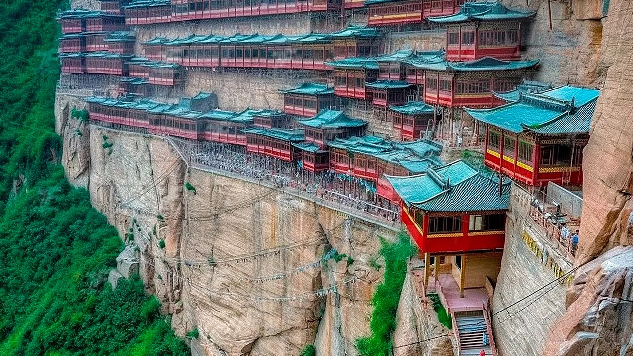 dias um fluxo de peregrinos corre para e não é surpreendente Este é um lugar único na china onde três conceitos religiosos taímo Budismo e confusionismo estão Unidos em um único templo construído na encosta de uma montanha embora a estrutura pareça estar pendurada no ar está firmemente presa à Rocha com grandes vigas de Carvalho aparafusadas na rocha Até agora ninguém se queixou de rangidos ou instabilidade nas Galerias Esperamos que muitos mais turistas visitem este famoso templo para chegar a este maravilhoso lugar o visitante intrépido deve superar mais de 8000 degraus é um longo caminho só para