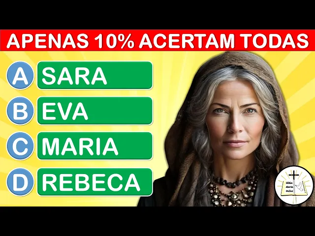 qual a única mulher cuja idade é mencionada na Bíblia alternativa a sar B Eva alternativa c Maria alternativa d Rebeca tempo para [Música] pensar a resposta certa é a letra A Sara sara viveu 127 anos Gênesis Capítulo 23 Versículo 1 pergunta 15 Qual bebida Paulo sugeriu que Timóteo tomasse para seus problemas de saúde alternativa a vinagre alternativa B azeite alternativa c vinho alternativa d Leite tempo para [Música] pensar a resposta certa é a letra C vinho Não continue a beber somente água tome também um pouco de vinho por causa do seu estômago e das suas