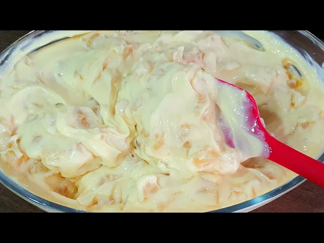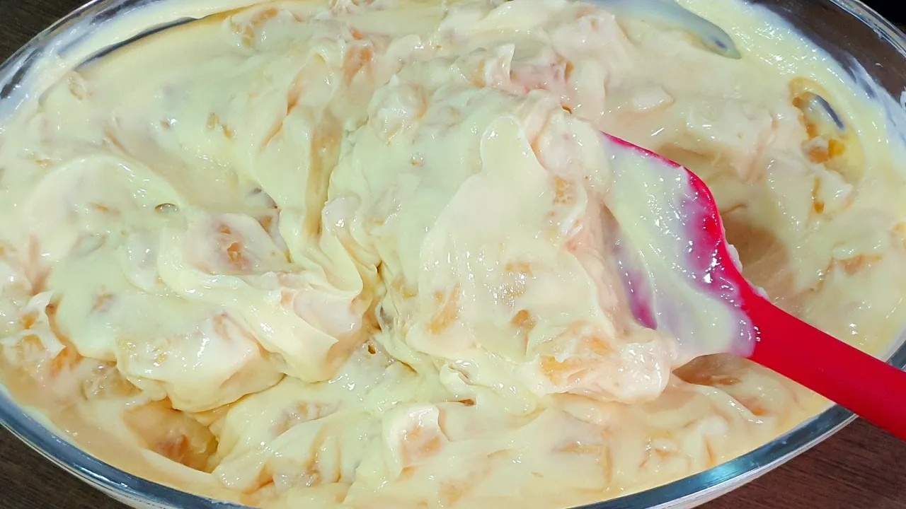 passa a espátula ó forma um risco no meio do creme tá vendo passou a espátula formou um risco é porque já está no ponto agora eu vou transferir esse creme aqui para o refratário Vou cobrir com plástico filme deixando plástico em contato com o creme para que ele esfrie sem formar aquela película por cima aí a hora que tiver totalmente frio eu volto para misturar o abacaxi então aqui ó pessoal o creme já esfriou totalmente vou retirar aqui o plástico e eu vou misturar agora aqui os pedacinhos de abacaxi o doce de abacaxi que eu