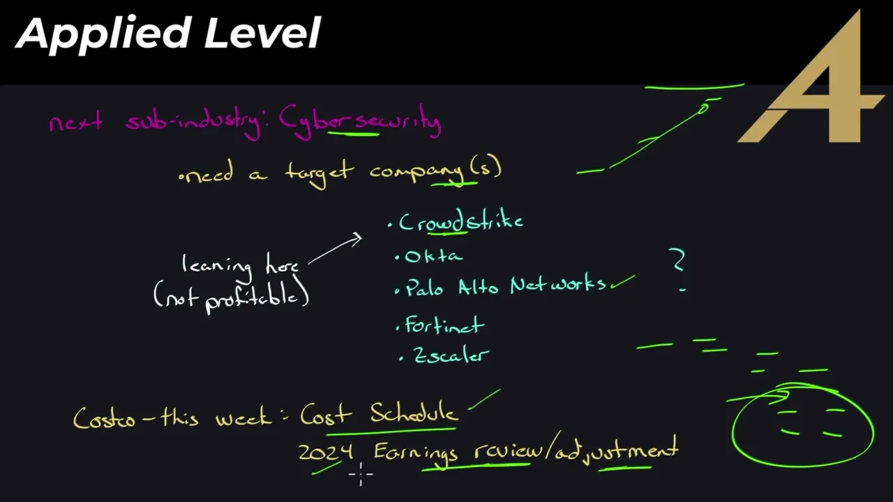 PSA done okay we have a lot to talk about this week but before we head in uh for the applied level our next sub industry I have time um the financial modeling is going going well I thought it would take up more of my time so I do have some time so I'm going to start the next sub industry uh by far it was cyber security in terms of uh where we were voting uh I need a Target company now uh I can pick one or I can crowdsource this one I put Five up here