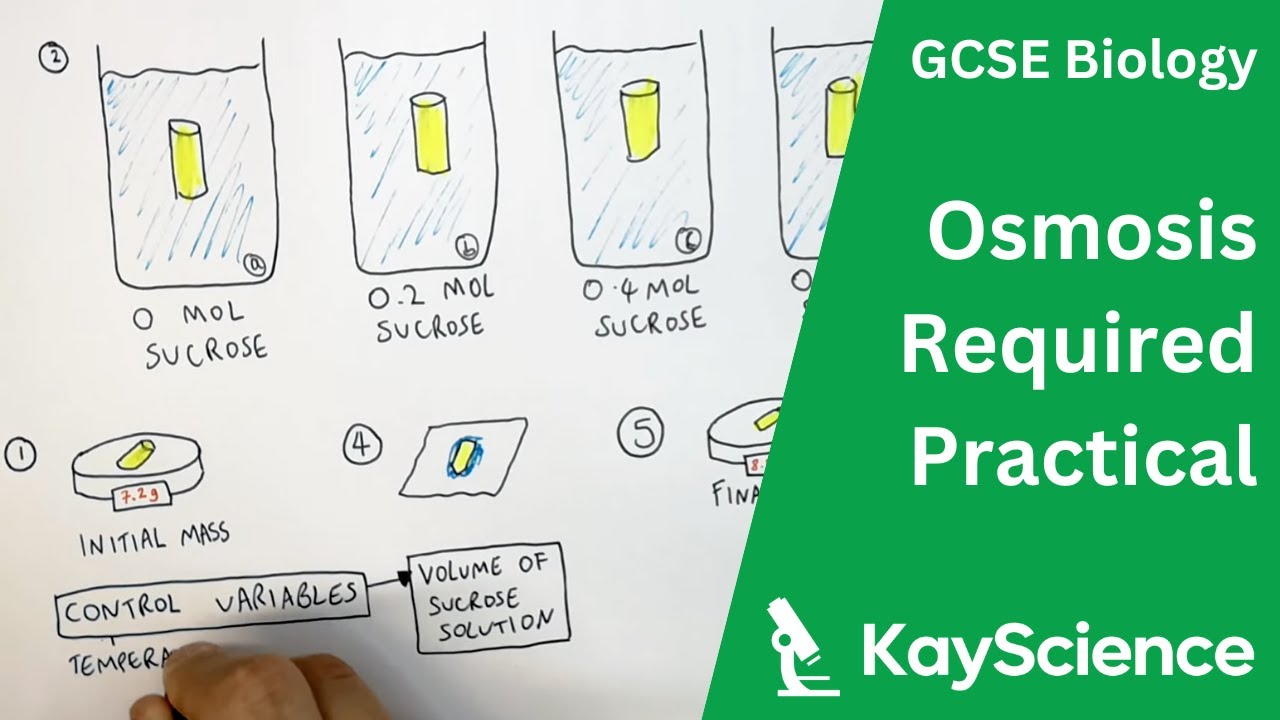 right today we're going to look at the required practical for osmosis looking at the effect of different concentrations of solutions on some plant tissue our plant tissue being a potato and we'll talk more about the different concentration of solutions in a moment but what I want to do first is prepare my potato my plant tissue to do that we have a cork board this is going to allow me to take samples and potato that are all the same diameter and that's going to important so I can compare my results more easily so here is one cylinder now I'm going to cut three cylinders I'm just going to set up three different concentrations of solution today so one cylinder to cinders and my third potato cinder notice these are all coming from the same potato that should help keep my results more consistent each other easier for me to compare my results with each other now what I want to do now is just going to cut the ends off the ends of these as a potato skin it's going to move those they are impermeable they will not allow water into the tissue that's not what we're looking for this experiment all about water either moving into the plant cells or out of the plant cells and that's really what osmosis is I've now got where cylinders they are all the same length which is vital or approximately the same length so again helping me to compare my results later on but the instructions asked me to measure them into three centimeter lengths so I'm just going to go with that but they are about same length which is fine so the cut each one now I'm only using a ruler here not the most accurate way of measuring these but we'll get will go with it I'll talk about that in a moment I've got one - so that's again three centimeters get getting as close as I can to three centimeters while using a ruler three so I now have three as identical I can get them pieces of potato tissue well I now need to do is measure them very accurately as best as I can I'm going to measure both their lengths using a ruler and also their maths using the top pan balance so the ruler I can measure them and that one is exactly thirty millimeters so they are all exactly 30 minutes millimeters now I need to record those results I need to note sure that I know the length of each sender if they're different they're all the same in this case it doesn't really matter so need to recall those in my results table and then it's away their mass so on this balance what I'm using here is a balance that has two decimal places on it so it is accurate to a hundredth of a gram so I'm using a very high resolution top top and balance here to get very accurate result we're going to see probably very small changes in our mass here which is why we need to use this piece of equipment why it's appropriate and we have a mass of 2. 92 grams so I need to record that in my results table having recorded the length and mass this potato cylinder it now go to my boiling tube boiling tube I need to place some liquid into it now I'm going to start with distilled water so this is pure water so it's our first one so the puts in here I'm going to get down level I level of the measuring cylinder so I can very measure very accurately 10 millimeter milliliters of distilled water so go try to keep everything exactly the same between all my expense to help me compare my results there's my distilled water very important and I'll label this so I know what's in here so I can't mix up my samples which would be make it very hard to work out what's happened this experiment it's so hot at the moment I am going to add a bun to this not necessary if we only do this experiment for a short period of time or if the weather is not too hot this will help prevent any evaporation liquid out of the tube so this is my first sample I need to do that for my remaining two cylinders adding 0. 25 molar sucrose so this is slightly sugary solution so it's got some sugar added to the water so this is sort of slightly sugary water and I'm going to add to another one 0.