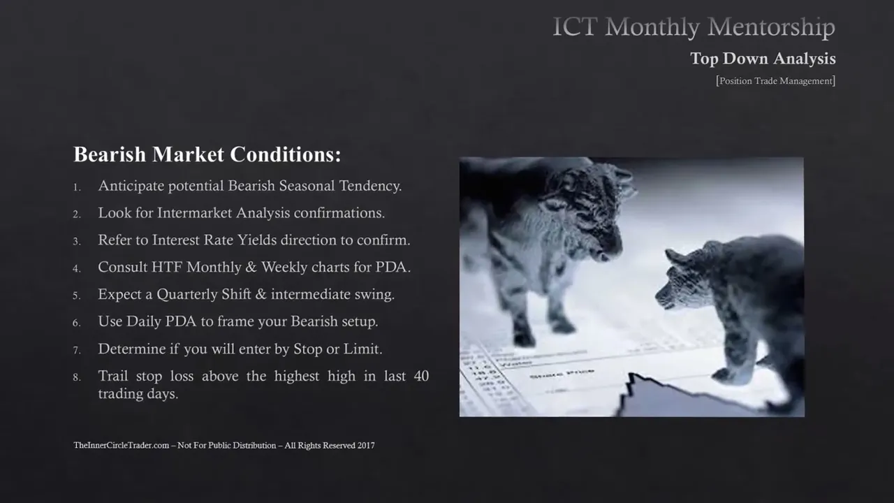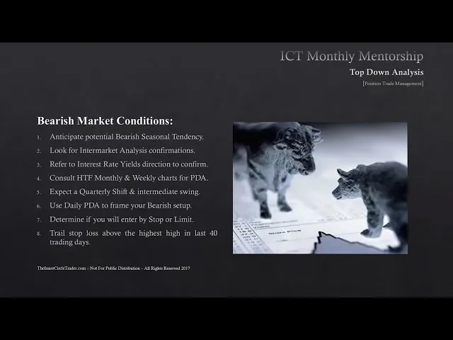 welcome back folks this is lesson eight of the January 2017 ICT mentorship this tutorial is going to be specifically dealing with the possession trade management okay for bullish market conditions we like to anticipate potential bullish seasonal tendencies and again like I preface in every one of the seasonal teachings it's not a Beyond though it's not a Panacea it's just a rule of thumb a road map if you will about what may unfold in price action just because it's done it for the last 40 plus years doesn't mean this year or next year or the three years from now when you sit down in front of the charts doesn't mean that's going to be the outcome you see in price but we start there because seasonal Tendencies are just that there's a tendency for price to do certain things since we're looking for bullish market conditions we're going to be focusing on the bullish seasonal tendencies that are most likely to occur in the next three to four months we went through some of my ideal seasonal Tendencies which ones I like and how it go in to the marketplace and look for them what we do after we identify what most likely will unfold for a bullish seasonal tendency is we have to look at inter-market analysis confirmations is there something to suggest there really is a bullish technical picture for that seasonal tendency to come to fruition if there isn't any technicals to align with that seasonal tendency this season it's a seasonal isn't going to drive price but technical is in alignment with the seasonal tendency are a very powerful couple what is the interest rate markets telling you okay are are yields increasing because if the yields are increasing it's going to be good for the currency that you're trading if we see Divergence between the yields that may suggest there's going to be a shift or a pause in the underlying direction of the marketplace at the current moment when we look at inter-market analysis we are blending the two of interest rate yields and we're also blending the four major asset classes the stock market interest rates Commodities and currencies all four of them together should be confirming your general outlook on the marketplace now you may not get clear pictures from all four but if you're getting three to indicate that your directional bias for your asset you're going to be trading is in fact what they're suggesting as well or confirming then you probably got a pretty good trade idea lined up once this occurs we go into a higher time frame monthly and weekly chart for PDA now PDA is premium discount array or PD array I'm going to be abbreviating that for the remainder of this mentorship so that way when you receive PDA it's the premium discount arrays that means the order blocks all the things I look for for institutional reference points we're looking for a higher time frame weekly and monthly charts to indicate where institutional overflow on those particular time frames will look to seek to trade to when we understand there's two higher time frames then we'll know what the daily chart is going to do and we're going to be focusing on the daily chart for a quarterly shift or intermediate price swing every three or four months we're going to be looking for this new price Wing to occur and we're going to be looking at inter-market analysis interest rate yields to suggest that is in fact unfolding we're not trying to pick the absolute low and we're not trying to pick the absolute High we are trying to get in sync with that quarterly shift to get the meat in between in other words the biggest portion of the move that's what we're focusing on we use the daily pdas to frame our bullish setups in other words we're looking for ore blocks voids gaps rejection blocks you know old highs hold lows we're looking for those things to to frame our buy setup we're waiting for that to occur based on what we see on the higher time frames and with intermarket analysis and hopefully a seasonal tendency is also suggesting a bullish move as well when we have these things in alignment we have a great deal of confluences in our camp we're looking for a high probability scenario in that case once you get to this stage what you're going to have to do is to you're going to have to determine whether you're going to be a buyer on a stop or a buyer on a limit it doesn't matter which one you'll elect to go with but just understand that if you are going to be trading with limit orders there's a probability of you missing moves or missing your fills because you're demanding a specific price level when you go on a buy stop generally you're going to end up getting filled more times using that order but unfortunately that creates a little bit more Gap in between where you're entering and where your stop loss is going to be if as long as you're not over leveraging your account which brings us to how much money should you be risking no more than one percent and again keeping the idea that you're taking big positions in terms of the time that you're in there but not big positions in the terms of how much you're allocating to the to the trades so you're looking for big moves with a little bit of your account by having that your risk is going to be reduced but your maximum payout is going to be massive in terms of how many Pips you draw but still it's going to be relative in terms of the percentage because it's just the nature of this time frame once you determine you're going to be buying on a stop or a limit and you enter the position you're going to be trailing your stop loss below the lowest low in the last 40 trading days now this brings us back to the ifta data range why are we looking for the lowest level last 40 trading days because if we're looking for a bullish move the market will most likely not want to go back 40 trading days to find the low it's going to be looking for the highs in the last 40 trading days so that means we are going to have a trailing stop loss order that's very handsomely behind th