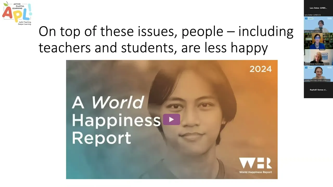 outcomes our keynot speaker very Renown professor of psychology Dr Katy H pasic will be giving us more uh valuable insights uh To this uh focusing on the importance of active playful learning for joyful teaching and deeper learning and thank you very much much for being with us today above all UNESCO sees the happy schools initiative as a transformative approach to education policy there are many inspiring School level practices happening around the world already including from some our speakers today from Bhutan Portugal Vietnam and Bulgaria however many education policies Uh prioritize still academic performance over all