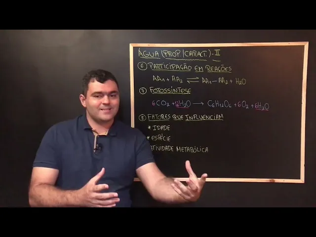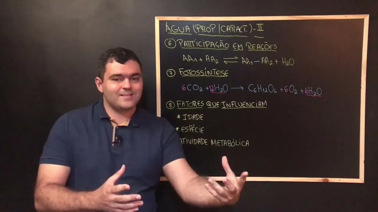 [Música] Fala galera ligado no projeto a prov mentoria tudo bem com vocês Professor Pedro aqui na área professor de biologia e nessa vídeo aula estaremos aí Encerrando o nosso estudo sobre a água no vídeo anterior paramos aí no número 5 vamos começar aqui número 6 como eu comentei para não ficar vídeo muito extenso aquela aula muito cansativa e tudo mais para você poder estudando aí aos pouquinhos daquele jeito Bacana Então dando início aqui dando início ao fim do nosso estudo sobre a água número 6 a água ela participa de uma série de reações químicas que