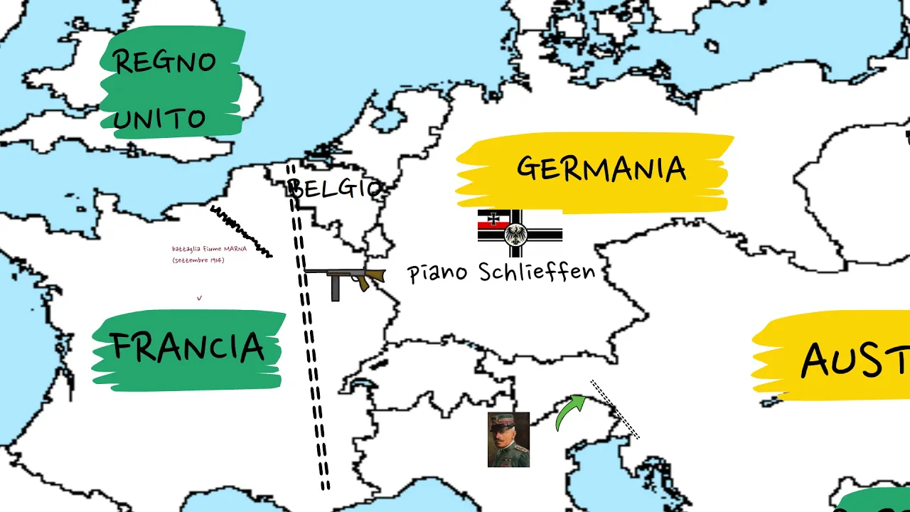 concentrare gli sforzi sulla russia ritenuta più lenta a mobilitare le sue truppe le fasi iniziali del conflitto sembra andare in questa direzione con i tedeschi che vi è nata la neutralità belga entra e non rapidamente nel territorio francese la mazzata tedesca viene però arrestata a meno a settembre per due motivi in primo luogo per la resistenza che gli inglesi ei francesi portano avanti sul fiume marna respingendo l'offensiva tedesca in secondo luogo per la rapida mobilitazione russa che costringe tedeschi a ridislocare le loro truppe sul fronte orientale la guerra di movimento si trasforma a questo punto