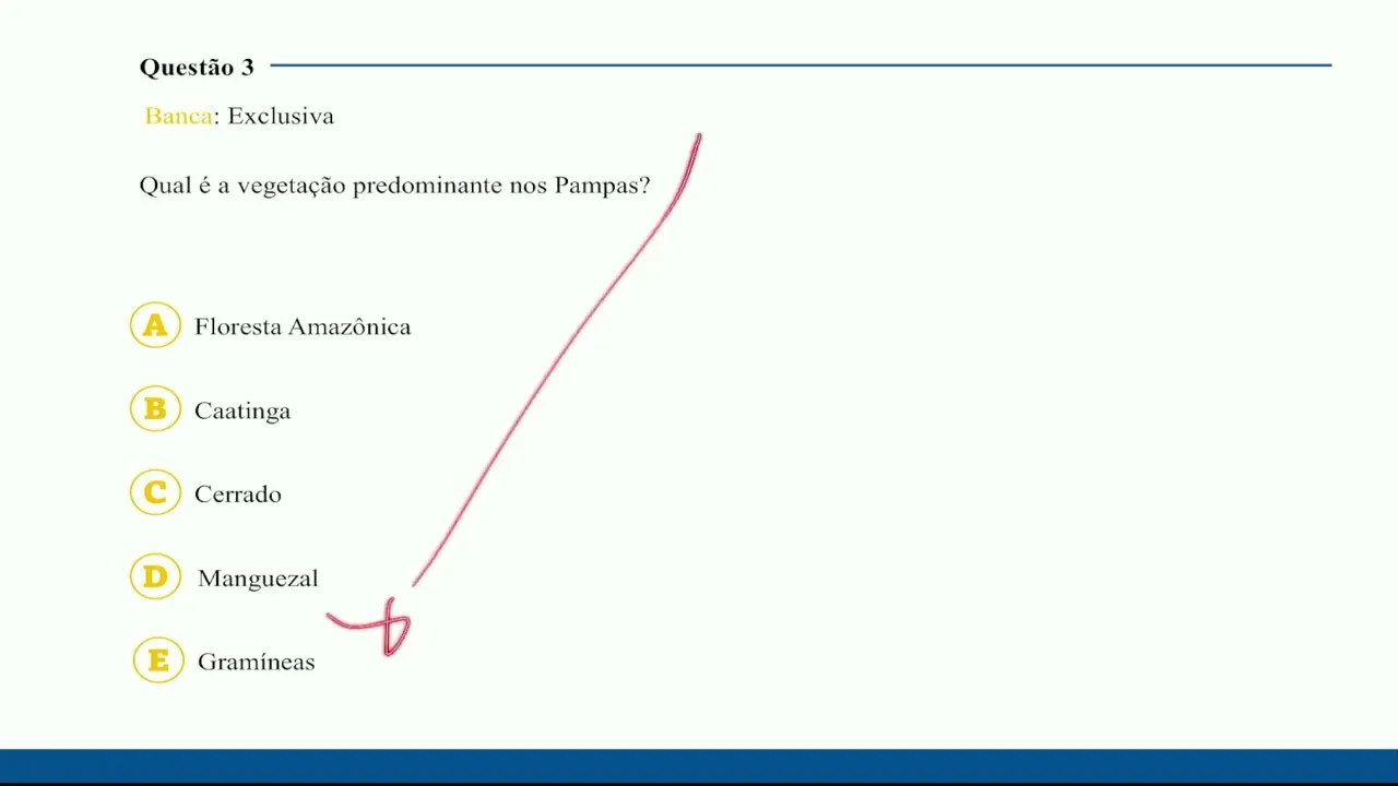 gente viu né Realmente aí a gente tem Campos abertos com graninhas e tem sim espécies aí que estão ameaçados de extinção Qual é a vegetação predominante nos Pampas aí fica tranquilo de responder que são as gramíneas né pelo que a gente já viu em aula até resolvendo a questão anterior também como eu relevo dos Pampas bom a gente sabe aí que não é montanhoso nem deserto que nem acidentado ele é plano com suaves ondulações né paisagem aberta e bastante regiões planas e o solo ele árido pobre nos dentes não né ele é rico em nutrientes