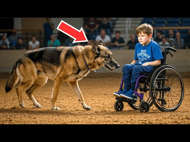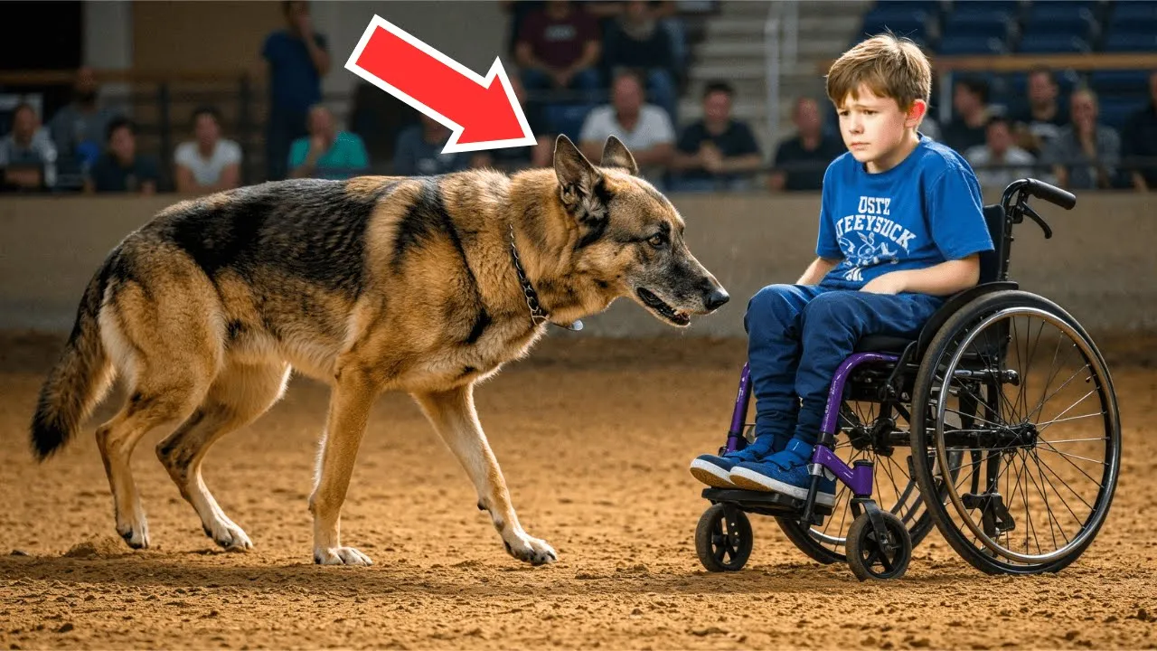 dog isn't Safe around strangers, especially kids." Mason tightened his grip on Shadow's lead, preparing to pull the dog back. But something unexpected happened. Shadow's aggressive posture softened, his ears shifting from their pinned back position to an alert, curious stance. The transformation was subtle, but unmistakable to anyone who understood canine body language. Ethan stopped his wheelchair about 10 ft away from Shadow. Instead of Reaching out or calling to the dog, he simply sat still, his eyes meeting shadows with quiet intensity. The arena fell silent, the tension palpable as everyone watched the standoff between the damaged boy
