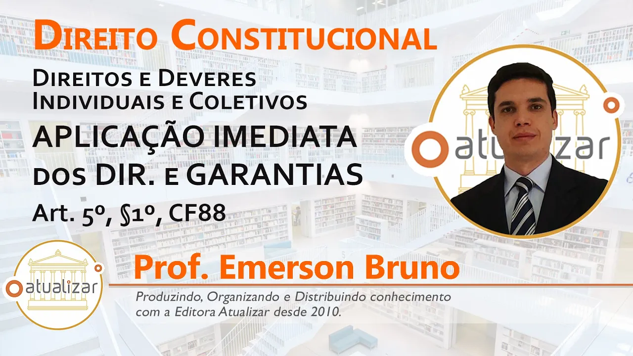 [Música] Olá amigos editor atualizar novamente com o artigo 5º da Constituição da República mas agora para falar dos parágrafos especificamente do parágrafo primeiro do artigo 5º da constituição muita gente tem dúvida com relação à regra ou melhor dizendo ao princípio contido no artigo 5º parágrafo primeiro do texto constitucional o que que é importante de se de se observar aqui Vejam Só Artigo 5º parágrafo primeo da Constituição da República as normas definidoras dos direitos e garantias fundamentais TM aplicação imediata atenção as normas definidoras dos direitos e garantias fundamentais tem aplicação imediata o que que se trata