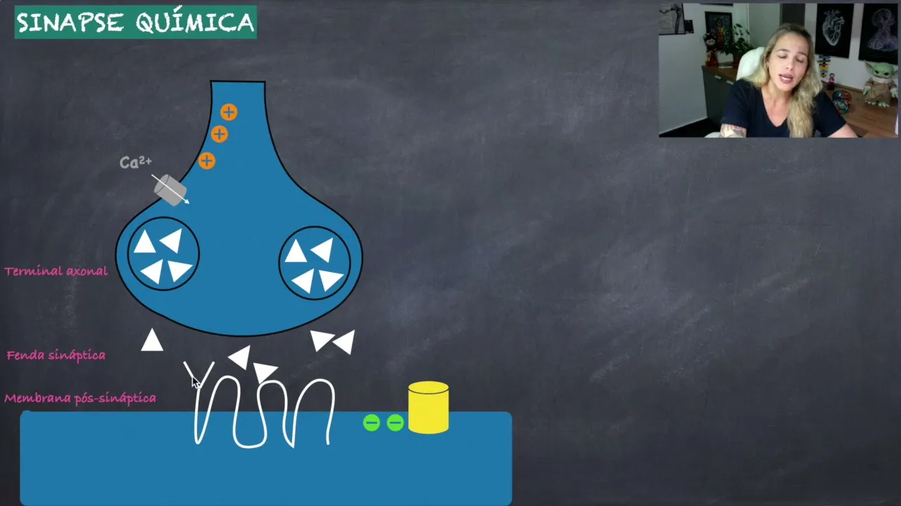 [Música] a sinapse dita química né que é justamente a sinapse Ou seja a comunicação de um neurônio com outro vai envolver os neurotransmissores como eu falei para vocês então pensa aqui o seguinte ó que isso aqui é um terminal axonal os neurotransmissores eles são estocados em vesículas tá que estão dentro da célula no citoplasma da célula finge que cada triangulinho desse aqui é um neurotransmissor aqui a gente tem um espaço entre um neurônio e outro pensa que aqui é o neurônio seguinte Então a gente vai ter a chamada membrana pós-sináptica aqui que é do neurônio