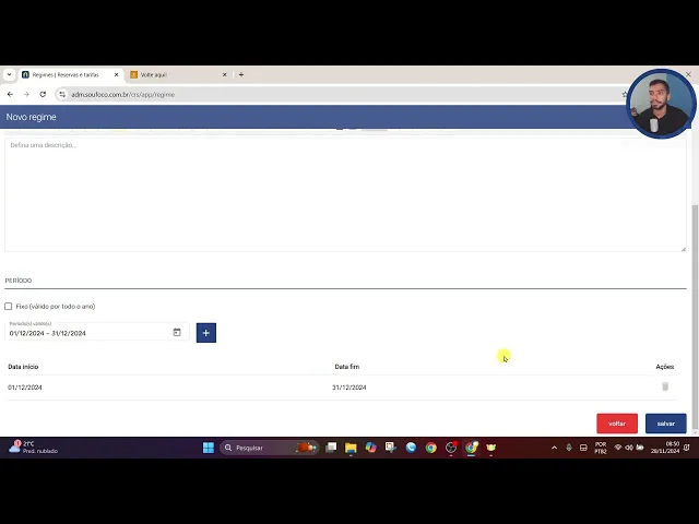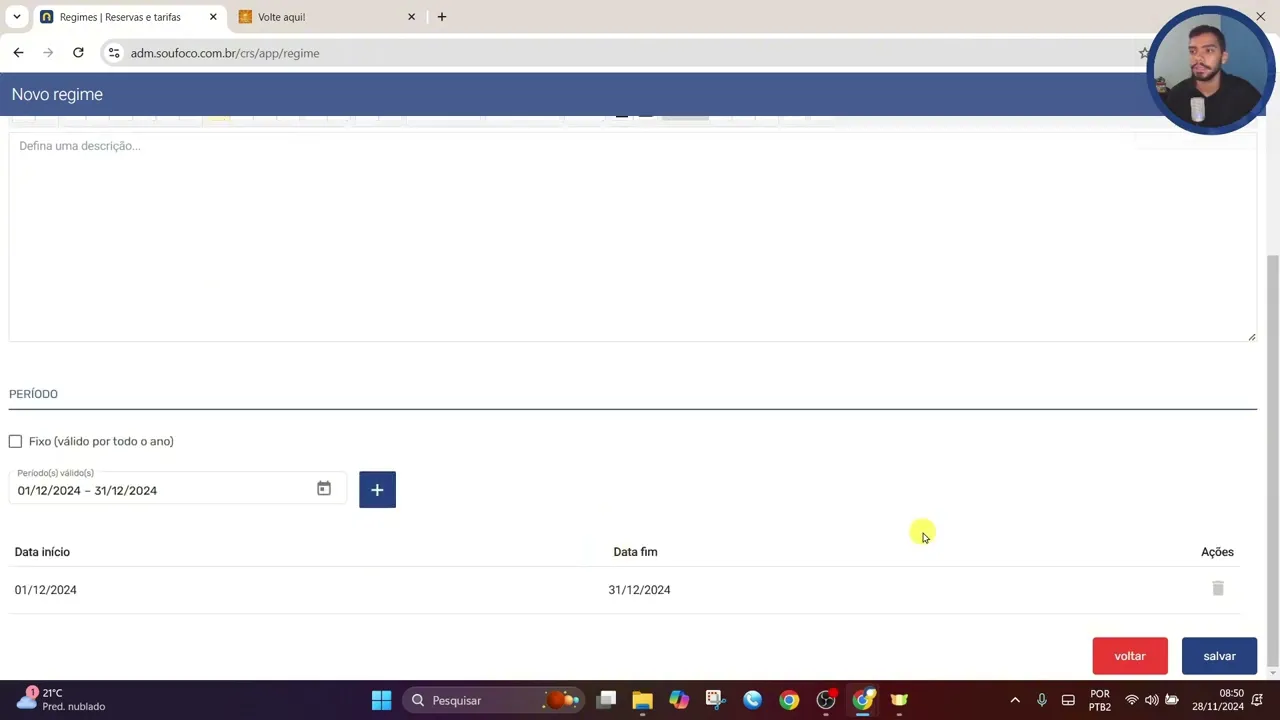 de regime tendo cinco opções tudo incluído pensão completa meia pensão café da manhã somente quarto neste caso será o pensão completa eu posso incluir uma descrição breve para ser apresentada no motor de reservas para que o hóspede o futuro hóspede tenha contato com essas informações e também uma descrição completa podendo detalhar ainda mais sobre o regime e abaixo temos que associar o período então aqui vou escolher o período como fixo para o ano todo ou escolher um período específico que eu posso incluir por exemplo somente em dezembro clico no símbolo mais e associo o período