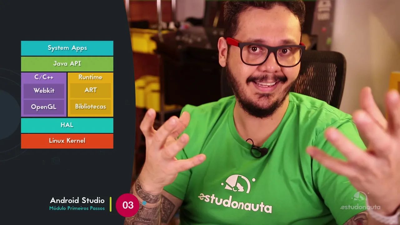 olá estou de volta em mais um vídeo desse primeiro módulo esse módulo 10 que é o módulo de primeiros passos você está vendo que os primeiros passos do android são muitos passos isso é normal acompanhe aqui comigo porque é um processo agora vou falar um pouco sobre a arquitetura do sistema você precisa entender um pouco mais sobre a arquitetura para você entender o que você pode fazer quando você vai estudar sei lá sistemas operacionais você não precisa estudar precisa entender o funcionamento das camadas do sistema operacional uma língua de programação exatamente igual quando você aprendeu