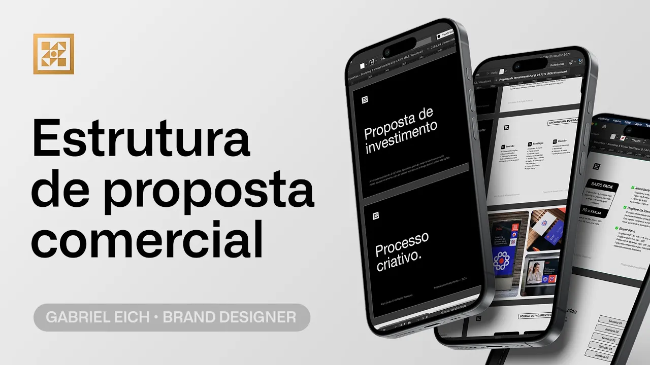 Fala galera como vocês estão mais um vídeo aqui no canal e hoje a gente vai falar sobre proposta comercial tá proposta de investimento enfim orçamento como vocês preferirem tá eu acho que a gente como designer é muito importante que a gente tenha uma boa proposta tá muito bem alinhada com os nossos objetivos que deixe né o orçamento assim mais profissional e que Facilite né Na hora de fechar a venda então é aquilo não precisa ser uma proposta mirabolante mas também não pode ser uma proposta muito simples né ela tem que ser direta ao ponto profissional bem diagramada ali bem organizada Clara e que né consiga agregar valor ao trabalho de vocês e essa proposta comercial junto de uma boa reunião com o cliente uma boa conversa uma boa troca de ideia com certeza Vai facilitar para ti aumentar o valor do teu trabalho tá bom então é isso gente antes de começar o vídeo só mais um anúncio tá reforçando para vocês que no dia 9 de Setembro vai acontecer a reinauguração da design Academy tá eu preparei muita coisa super especial para vocês tá e a plataforma vai ficar incrível tá novos cursos chegando aí uma nova Interface para vocês quem adquirir no dia 9 vai receber a mentoria coletiva os 30 primeiros né vai receber acesso vitalício da plataforma vai receber o meu curso de vendas até o final do ano e cara é muita coisa boa tem um brin kit 2. 0 também para receber muita coisa legal para vocês crescerem no mercado e ter Todo o material né para facilitar o processo Porque a design Academy vai servir para isso para encurtar a jornada de vocês para você chegar no objetivo de vocês de uma forma muito mais rápida Beleza então aproveitem aí que tá muito especial e vai ser com certeza o maior evento do ano da design Cary Fechou então é isso galera tamo junto e bora pro conteúdo Bora pro conteúdo então gente já tô aqui com a minha proposta de investimento que eu uso com meus clientes tá famosa proposta comercial e galera aqui eu vou mostrar o passo a passo que eu utilizo na minha proposta e galera é aquilo vocês não não seguir arrisca tudo que tá aqui não precisa colocar igual tá é aquilo eu tô dando essa aula para vocês para vocês se inspirarem para esclarecer processos e tal mas por favor façam do jeito de vocês tá da metodologia de vocês Até porque assim porque se todo mundo copiar de todo mundo fica tudo igual então usam realmente como como inspiração beleza deixando claro aqui também que essa proposta eu fiz junto com um amigo meu o Rodrigo tá Rodrigo Balbino Então se tu é aluno dele já acessou os materiais dele e tal e a proposta dele tá parecida com a minha com a minha ninguém copiou ninguém tá a gente fez a proposta juntos mesmo só para deixar claro Tá bom então gente mais um aviso Zinho aqui antes de começar e é muito bom lembrar vocês essa proposta aqui juntamente com meu modelo de apresentação que eu uso com meus clientes ó completaço aqui com várias etapas 8 85 lâminas manual de identidade visual com as métricas com as diretrizes de uso contrato que eu utilizo com meus clientes no estúdio E também o briefing tudo isso aqui todos esses cinco materiais vão estar inclusos no Brand kit 2. 0 Beleza então lá no início do vídeo eu falei sobre o evento né da design Academy a reinauguração que vai acontecer no dia 9 de Setembro e quem adquirir também vai ter acesso a todos esses materiais tá então cara tá imperdível né E lembrando gente é o Brand kit 2.