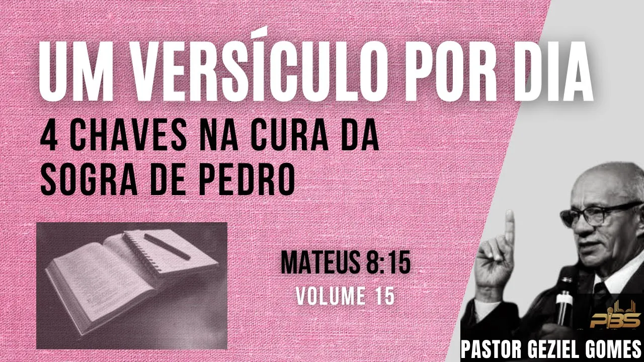 [Música] versículo por dia sou grato a Deus por essa oportunidade que se repete diariamente e pelo privilégio contar com a sua participação nesta série de meditações bíblicas e de edificação espiritual o versículo para hoje é o de número 15 do capítulo 8 do Evangelho de Nosso Senhor Jesus Cristo conforme escreveu Evangelista Mateus assim está escrito e tocou ele na mão e a febre a deixou e levantou-se e servíamos quero destacar Quatro Chaves na cura da sogra de Pedro que é o personagem apresentar por Mateus neste Capítulo Capítulo 8 de seu evangelho As Quatro Chaves da