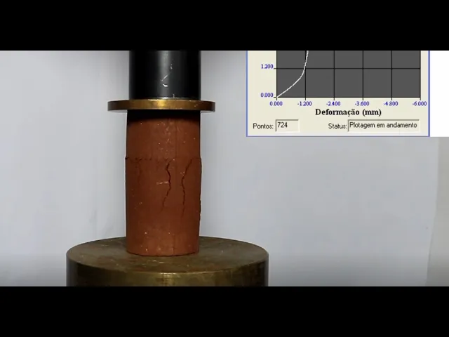 específica de dois por cento por minuto assim a velocidade estabelecida foi de 2 mm por minuto é sobre a base da prensa coloca-se um apoio para o corpo de prova e acima do corpo-de-prova posiciona-se o cabeçote superior ou qual transformar a força axial em uma tensão de compressão e após a centralização do corpo-de-prova com o eixo da aplicação da carga inicia-se um ensaio de compressão simples e ao lado do corpo de prova estão indicados os valores medidos durante o ensaio referentes a força aplicada e o deslocamento axial E aí [Música] E aí E aí [Música]