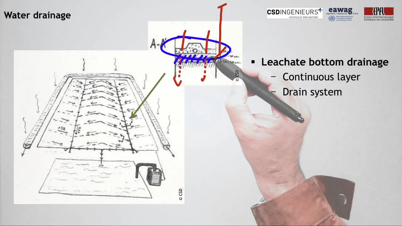 To avoid that, the leachate drainage is realized through a continuous drainage layer of twenty or thirty centimeters of pervious material. It is possible to use inner-construction waste for that β like bricks or concrete waste. The best is to add drainage tubes with a design allowing a future access from outside for possible control and cleaning of the main tubes.