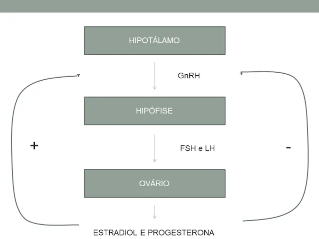 vocês pessoal isso aqui conteúdo então da aula passada tá nós temos um eixo que é chamado de eixo e pô talâmico e por fisario gonadal que é o eixo que libera hormônios e são esses hormônios que regulam o ciclo estral tá o ciclo estral ele começa a partir do momento que o hipotálamo libera diretamente na hipófise através de um sistema que nós chamamos de sistema porta e por fisario tal seja o hipotálamo libera gnrh diretamente na hipófise ela não esse gnrh não precisa cair na circulação do animal oi e o gnrh então é liberado pelo