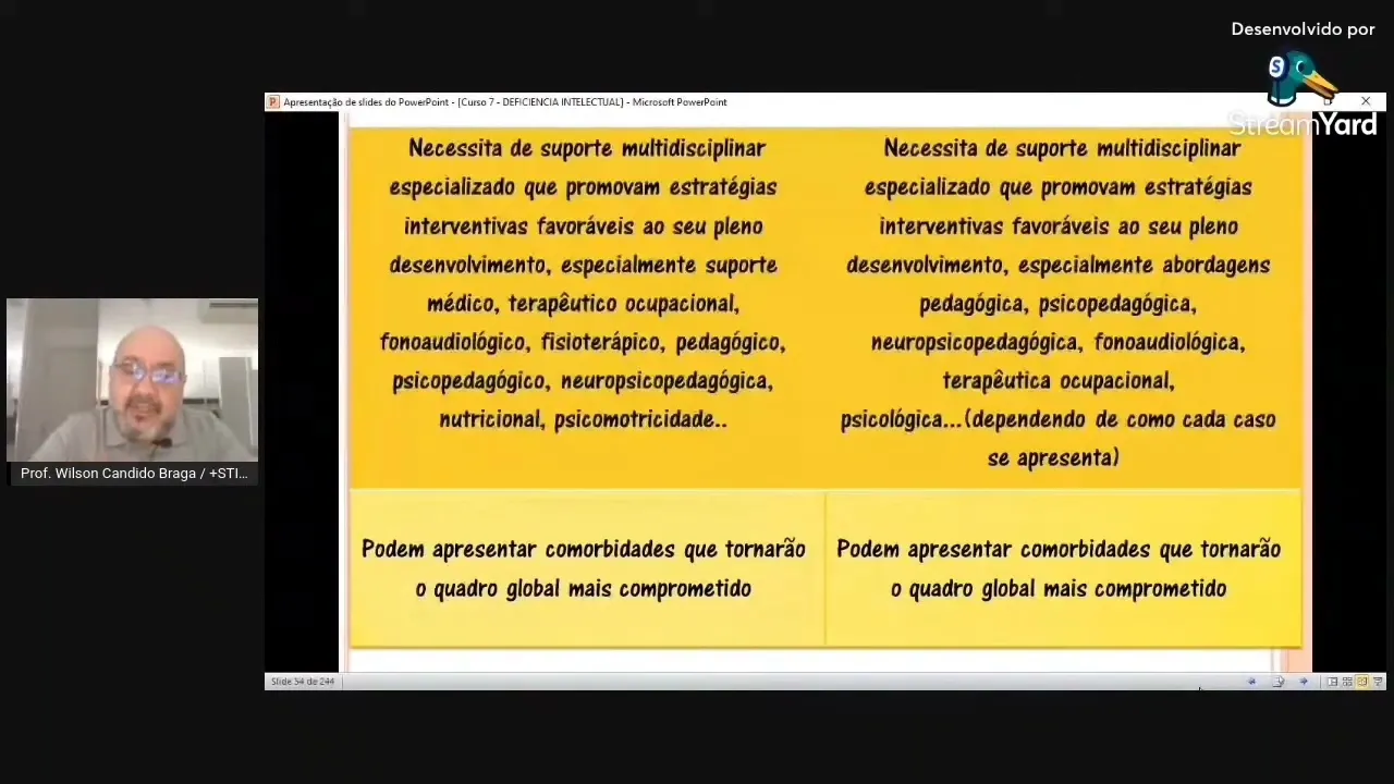 esse prejuízo intelectual que traz imaturidade que traz dependência ou parcial Dependência em atividades do dia a dia precisa ser trabalhado por professores desde a educação infantil até etapas mais avançadas com ferramentas acessíveis adequados à condições que aquele sujeito apresenta precisam ser compreendidas por parte das multidisciplinares para que pensem elaborem planos de intervenção que venha de fato a auxiliar no desenvolvimento da pessoa com deficiência a partir da sua estimulação orientar a família de que aquelas dificuldades não é preguiça não é birra é uma dificuldade associada a um prejuízo de funcionamento cerebral que precisa ser entendida para