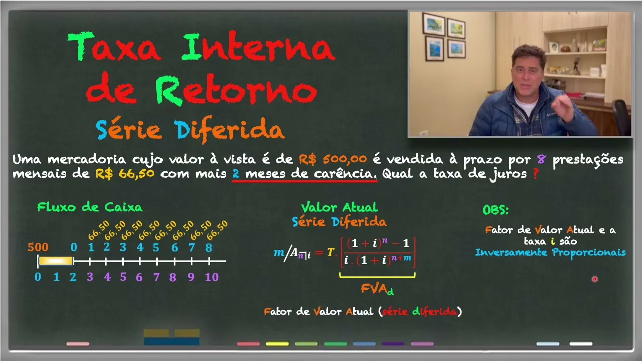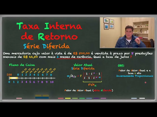 o prazo de carência ela torna-se uma série postecipada é os pagamentos del são feitos sempre no final de cada período tá Mas então a diferença é que tem esse prazo de carência então vamos fazer o seguinte vamos dar uma olhadinha no material que eu preparei para vocês de Olha lá então então vamos lá então disse assim ó taxa interna de retorno né da série diferida bom a taxa interna de retorno é aal do tir que inclusive tá a sigla colocada em verde ali né deix de colocar um laser aqui só para te chamar atenção caso