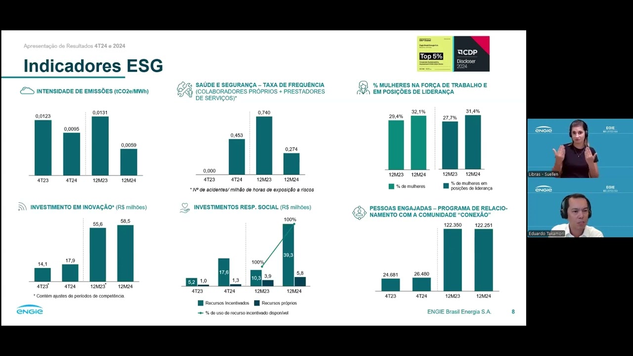 Olá sejam todos bem-vindos à conferência de resultados da cio sistemas apresentaremos a seguir a performance financeira da companhia no quarto trimestre de 2024 ao final da apresentação os executivos estarão disponíveis para responder eventuais perguntas e antes de iniciarmos é importante esclarecer que as informações contidas nessa apresentação e eventuais declarações que possam ser feitas durante esta videoconferência sobre perspectivas de negócios õ e metas operacionais e financeiras da Senior sistemas constituem-se em crenças e premissas da Diretoria da companhia bem como em informações atualmente disponíveis considerações futuras não são garantia de desempenho elas envolvem riscos incertezas e premissas pois se referem a eventos futuros e portanto dependem de circunstâncias que podem ou não ocorrer condições econômicas Gerais condições da indústria e outros fatores operacionais podem afetar o desempenho futuro da Senior e podem conduzir a resultados que diferem materialmente daqueles expressos Em tais condições futuras fiquem agora com a videoconferência da Senior sistemas Bom dia eh sejam todos muito bem-vindos mais um uma conferência dos resultados agora falando para vocês dos resultados do último quarto quarta de 2024 E também como foi o resultado do ano eh 2024 acumulado né Eh 2024 eu acho que fica marcado por algumas conquistas nossas eu acho que a conquista mais importante nós tínhamos um planejamento de muito longo prazo de chegar no nosso primeiro bilhão eh E chegamos né No final do ano terminamos com faturamento bruto ali por volta de 1 bilhão 100 milhões e fizemos eh vários eventos ao longo do ano passado para fortalecer a nossa marca né para vocês terem uma ideia foram mais de 30 eventos na não só aqui no Brasil mas também na Colômbia eh e a gente tem feito isso e vai continuar fazendo agora no ano 2025 para fortalecimento cada vez mais da das nossas marcas e o outro ponto importante também no ano passado nós fizemos o nosso planejamento estratégico para pros próximos 5 anos eu vou falar um pouquinho eh no no final da nossa apresentação aqui com um novo posicionamento e uma nova visão da sor aqui nos próximos 5 anos então alguma dúvida que vocês tenham pode colocar no chat ou no final da apresentação se vocês tiverem alguma dúvida podem perguntar e caso queiram depois surgiu alguma dúvida por favor envia para o nosso R aqui que a gente eh prontamente responde para vocês tá então entrando um pouco no nos números do ano do no ano de 2024 como terminamos eh no acumulado quando a gente fala na nossa receita líquida terminamos com 976 milhões eh de receita líquida é um crescimento super forte 23 contra 24 crescemos 16,8 por. e continuamos também quando nós olhamos os últimos 5 anos um ker aí de 20,7 por. então uma empresa que continua crescendo e crescendo super forte a nossa estratégia de migração dos nossos clientes eh cada vez mais para uma receita recorrente pro Cloud vem dando super certo a gente pode olhar neste gráfico do meio a receita recorrente já chegou a 79,3 e vem ganhando participação ano após ano né a gente fala quando 2020 era 69% já é 79 eh de participação e a mesma coisa com o cloud o cloud hoje já é 56% de participação quando a gente fala eh na receita recorrente então ele vem ganhando participação ano após ano e a gente continua acreditando que ele vai continuar crescendo forte até porque as novas soluções todas já estão em Cloud os clientes estão migrando eh para as nossas Soluções em Cláudio então é natural que ele venha ganhando participação ano após ano com relação eh à lucratividade também eh nós terminamos o ano de de 2024 com ebitda de 276 milhões isso com a margem de 28.