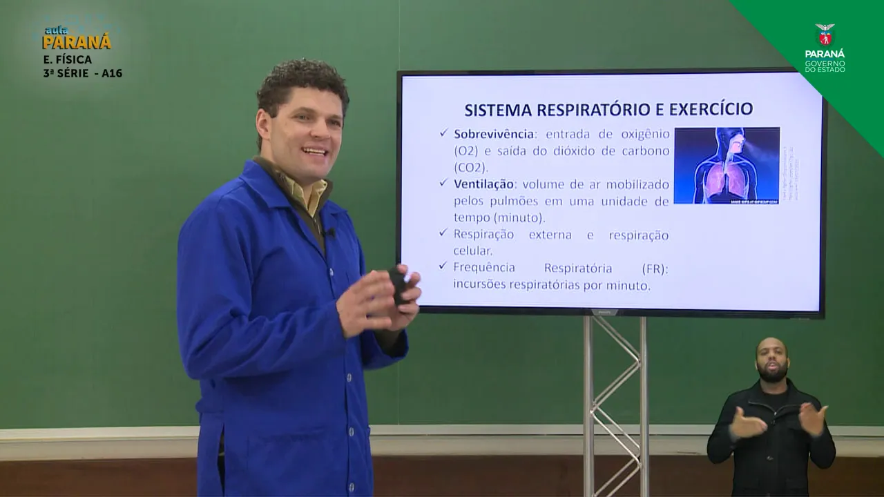 de tempo por minuto essa ventilação ela vai aumentar em função da prática de exercício físico a respiração ainda externa e interna respiração celular a exploração externa envolve o nariz a traqueia brônquios bronquíolos é alvéolos pulmonares as trocas gasosas oxigênio e dióxido de carbono e esse processo externo além disso nós temos a respiração celular ou seja como é que se oxigênio que entrou pela minha respiração do metabolismo aeróbio como é que ele vai participar da liberação de energia a partir da fonte energética bom e nós temos ainda frequência respiratória ou seja incursões respiratórias por minuto quantas