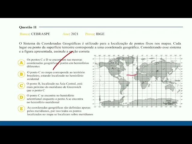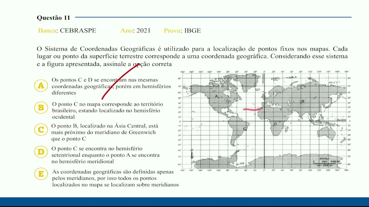 gente poderia enxergar dessa forma mas eles não estão na mesma coordenada né Então tá errado isso daqui o ponto c no mapa que tá aqui corresponde ao território brasileiro realmente estando localizado no hemisfério ocidental lembre que a gente usa o ocidental para o oeste e ele tá realmente né porque aqui a gente tem a linha de grande wish então letra B correta o ponto b localizado na Ásia Central está mais próximo do meridiano de Greenwich do que o ponto c que tá aqui o ponto c tá meio ruim para mim enxergar aqui mas ele tá