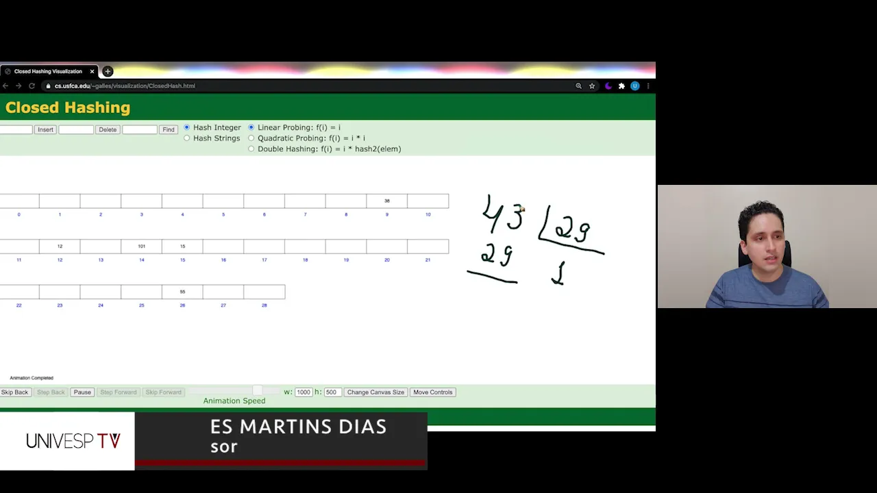 gente viu na parte teórica Eu recomendo que você fique brincando aqui um pouquinho mais com essa ferramenta até você ficar acostumado aí com a teoria e acostumado a ver o vetor interno sendo preenchido o vetor interno sendo remover remover elementos e também dá um faz colocar um faz aqui no 44 ele procura na posição 15 depois na posição 16 e depois ele encontram 44 na posição em 17 se eu procurar agora o elemento por exemplo o elemento 16 ele vai procurar nessa posição aqui não vai encontrar ele vai procurar nessa posição aqui não vai encontrar