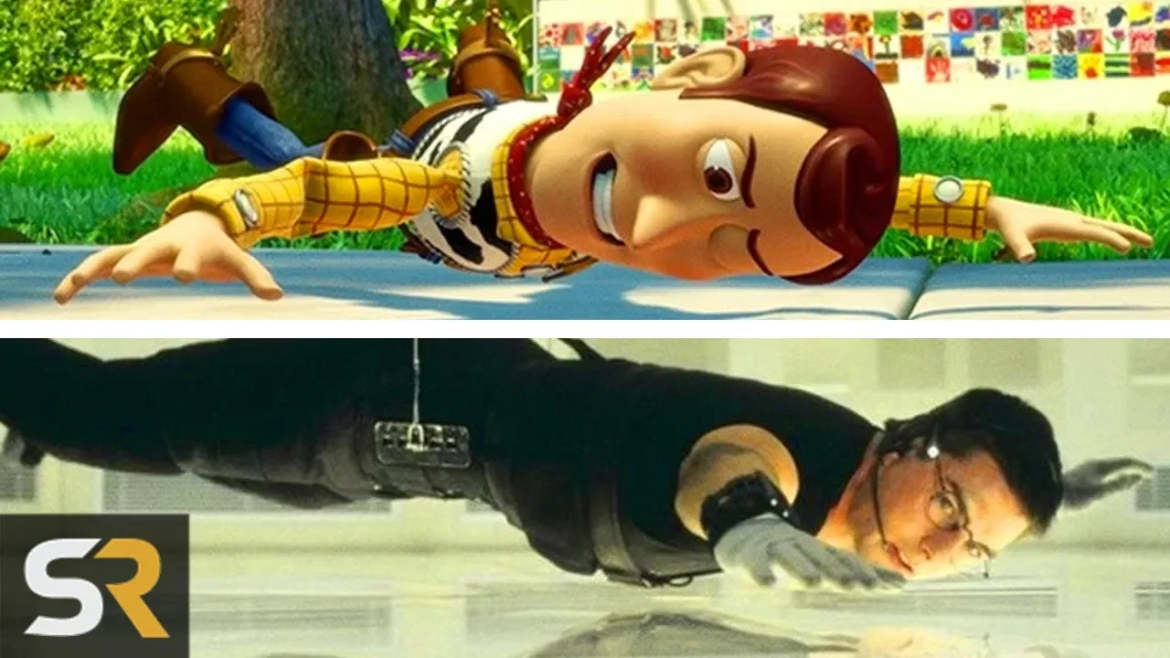 a prolonged No up to the sky as the camera pulls away it's impossible to miss there are a ton of stolen scenes and references in Toy Story 3 but for the sake of time we'll include just one this great one was taken from the original mission impossible in one of the most suspenseful scenes in the movie we see Tom Cruise being lowered into a hyper son of chamber in order to download stolen data onto a floppy disk but is accidentally dropped and left to hover an inch above the ground Toy Story 3 recreates this exactly