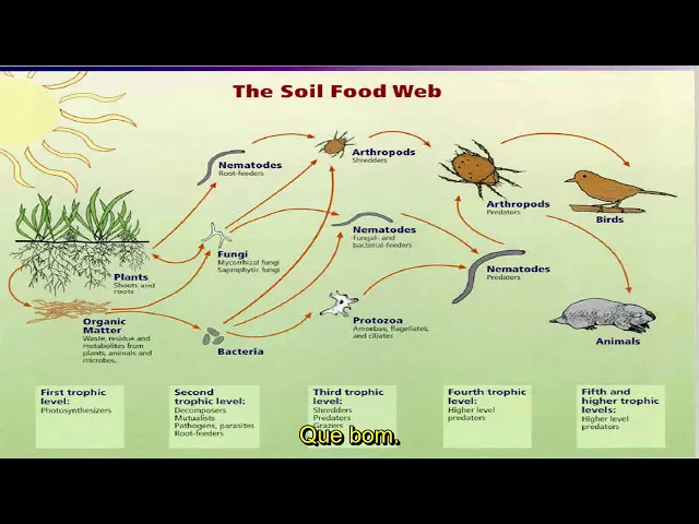 a look at the soil food web and please please realize that before nineteen eighty six most scientists had no idea that all of these organisms were important and that they had a role in making sure your plant stayed healthy so when we're looking at just I wish the pointer oh I I gotta do I can't see that Oops pointer it suddenly appeared it was a snake it would have bit me oh my can you see the little red can you see the red dot oh sure because I can't so sunlights photosynthesis plants make sugar most